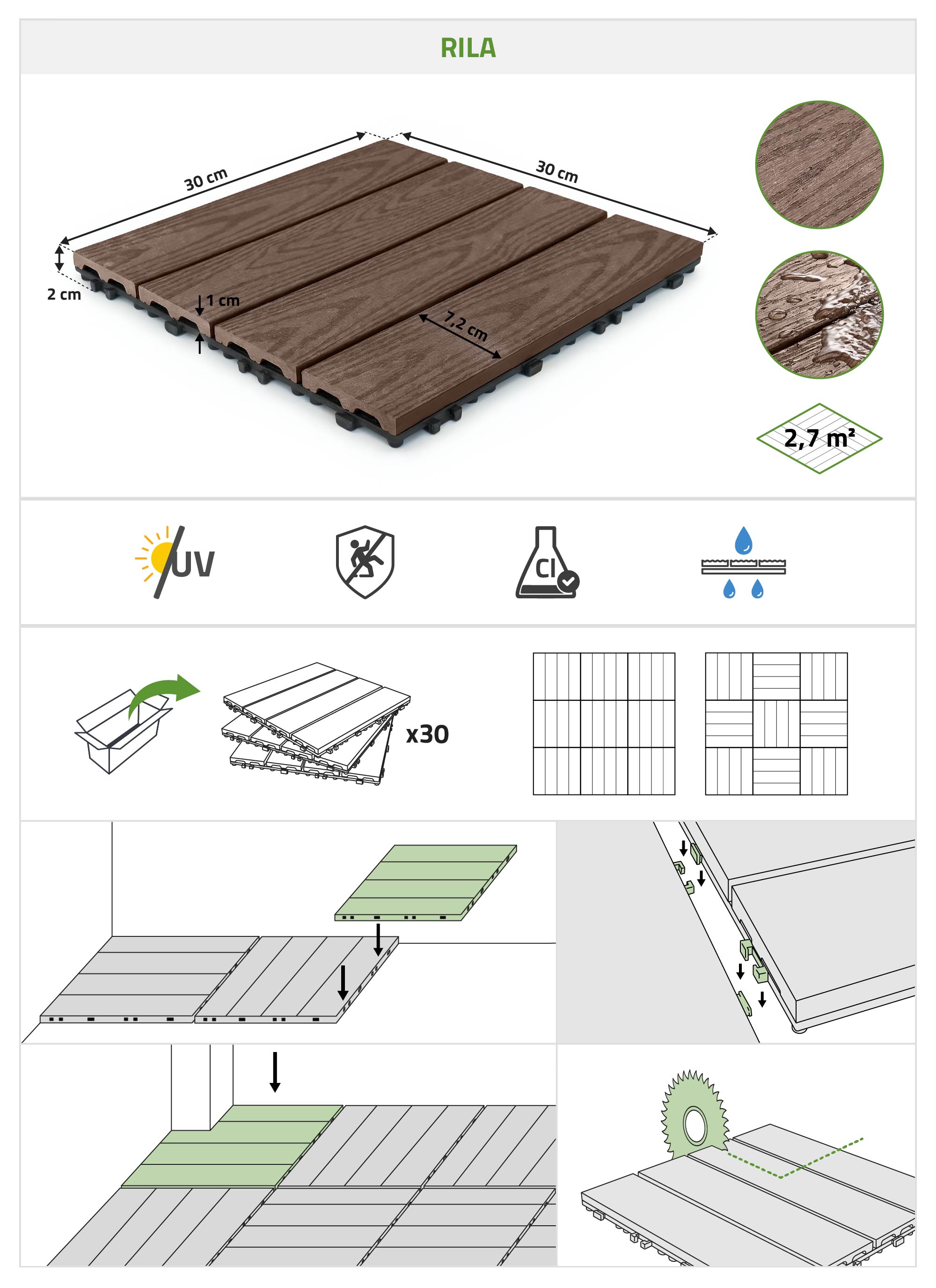 Balenie 30 hnedých kompozitných zámkových terasových dlaždíc RILA, 30x30 cm