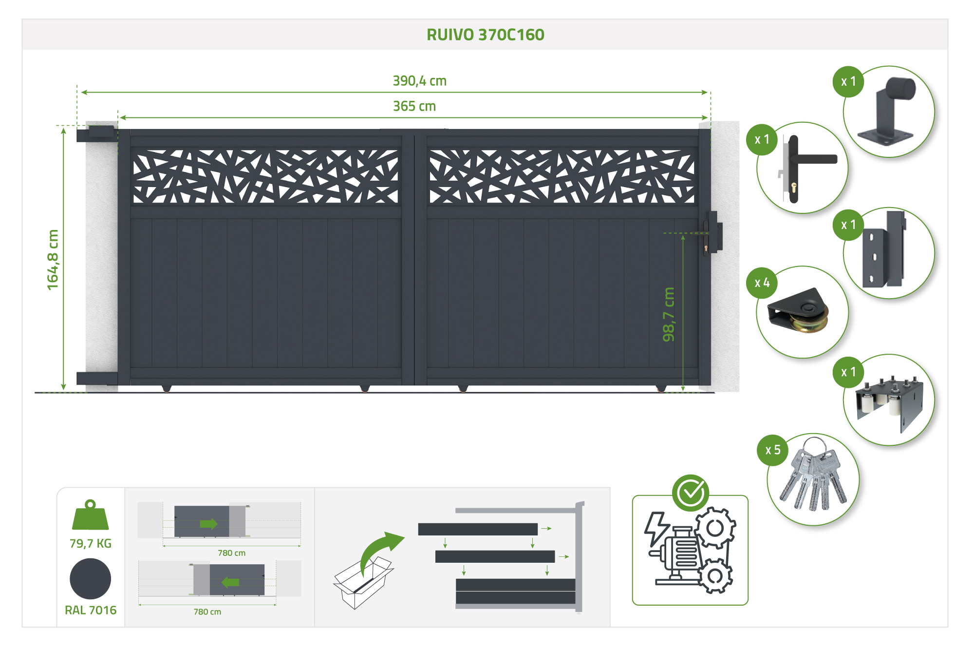 Brána posuvná 3,7m DOLOMITE RUIVO V.160cm šedý hliník