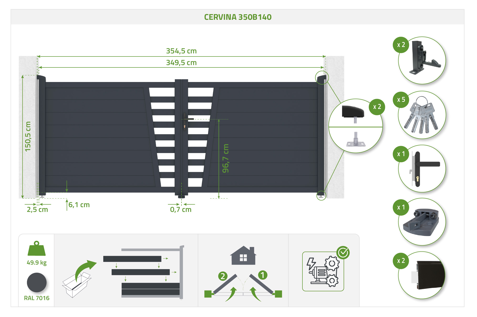 Minimálna výška stĺpikov tejto otočnej brány je 160 cm.