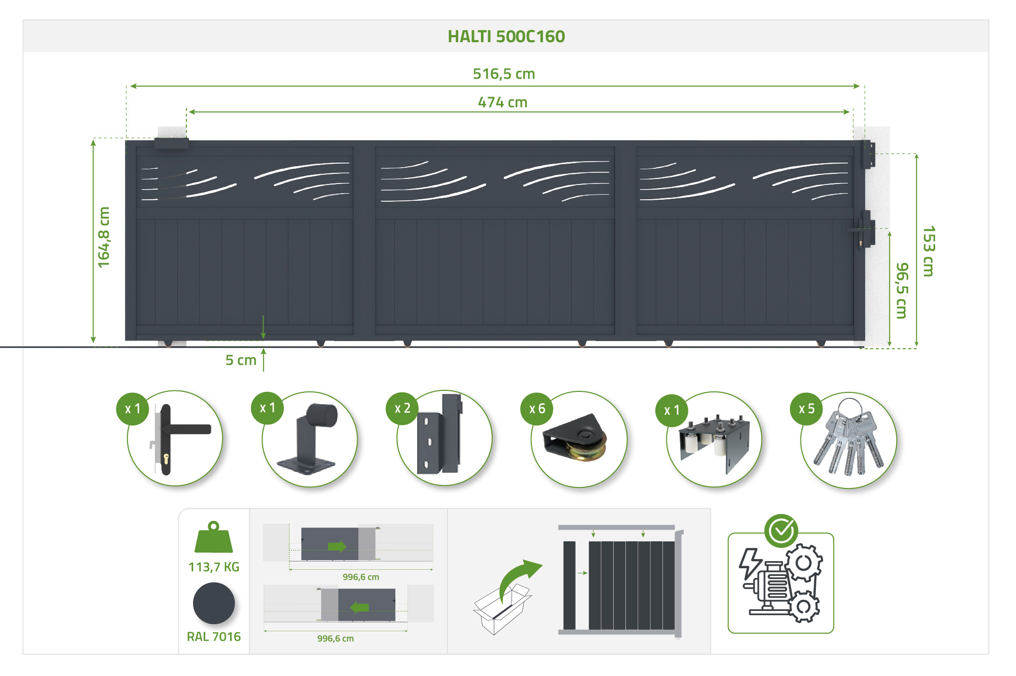 Posuvná brána HALTI 5m, výška 160 cm, sivý hliník