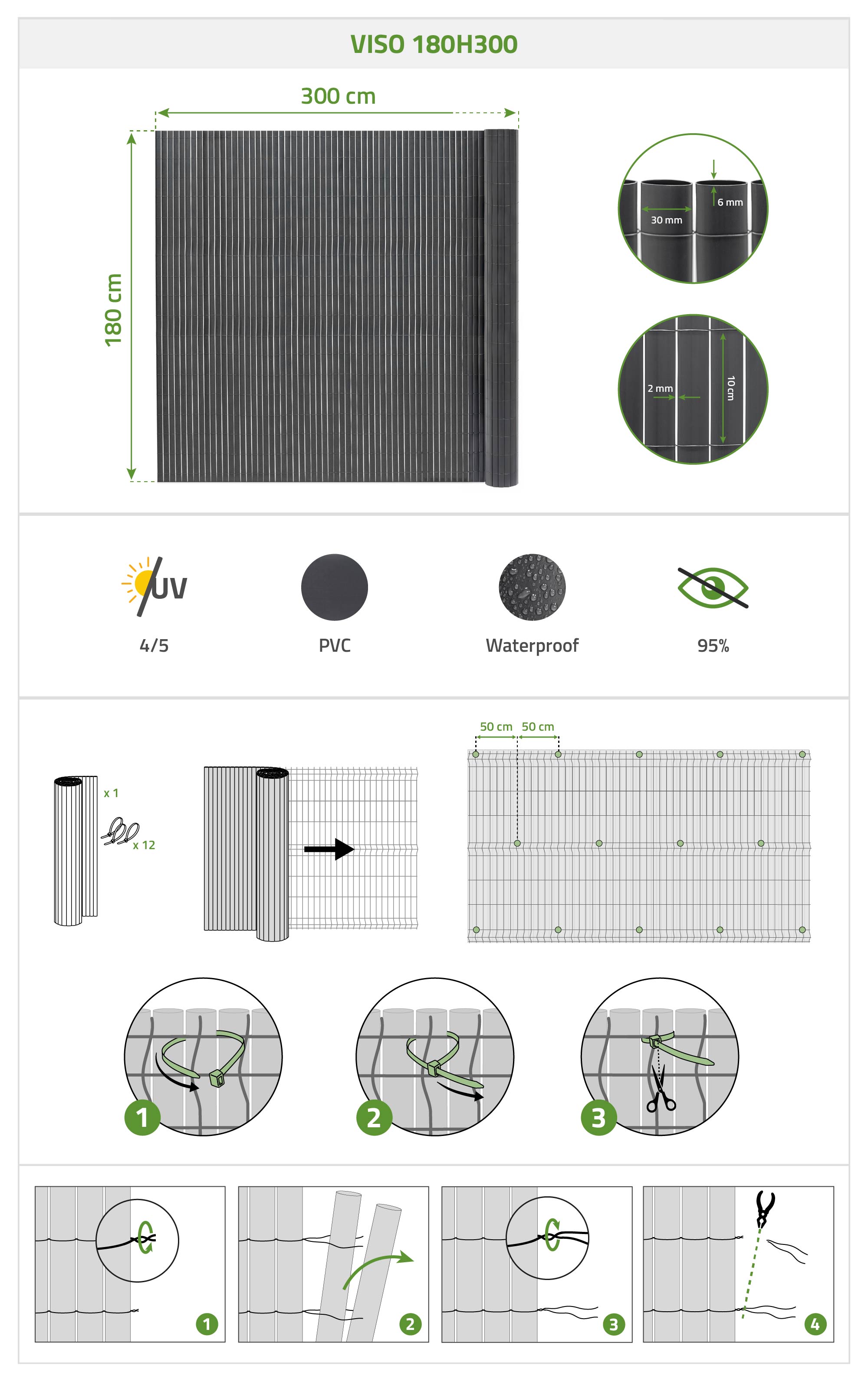 PVC rákosová sieť VISIO má 30 mm lamely, ktoré poskytujú až 95 % súkromia, chránia vaše súkromie a zároveň umožňujú prenikanie svetla. S hustotou 1,6 kg/m² zostáva stabilná a pevná, odolná voči poveternostným vplyvom a má dlhú životnosť. Vďaka vynikajúcej odolnosti voči UV žiareniu si zachováva svoj vzhľad a farbu sezónu čo sezónu, čím vytvára estetický a zároveň efektívny súkromný zásten. Každá lamela PVC rákosovej siete VISIO je spojená kovovým drôtom potiahnutým polyetylénom (PE), čo zaisťuje stabilnú a odolnú konštrukciu. Táto metóda montáže, robustnejšia ako nylonový drôt alebo lepidlo, zaručuje čistý povrch a prispôsobivú inštaláciu vďaka možnosti odrezať sieť na požadovanú dĺžku.