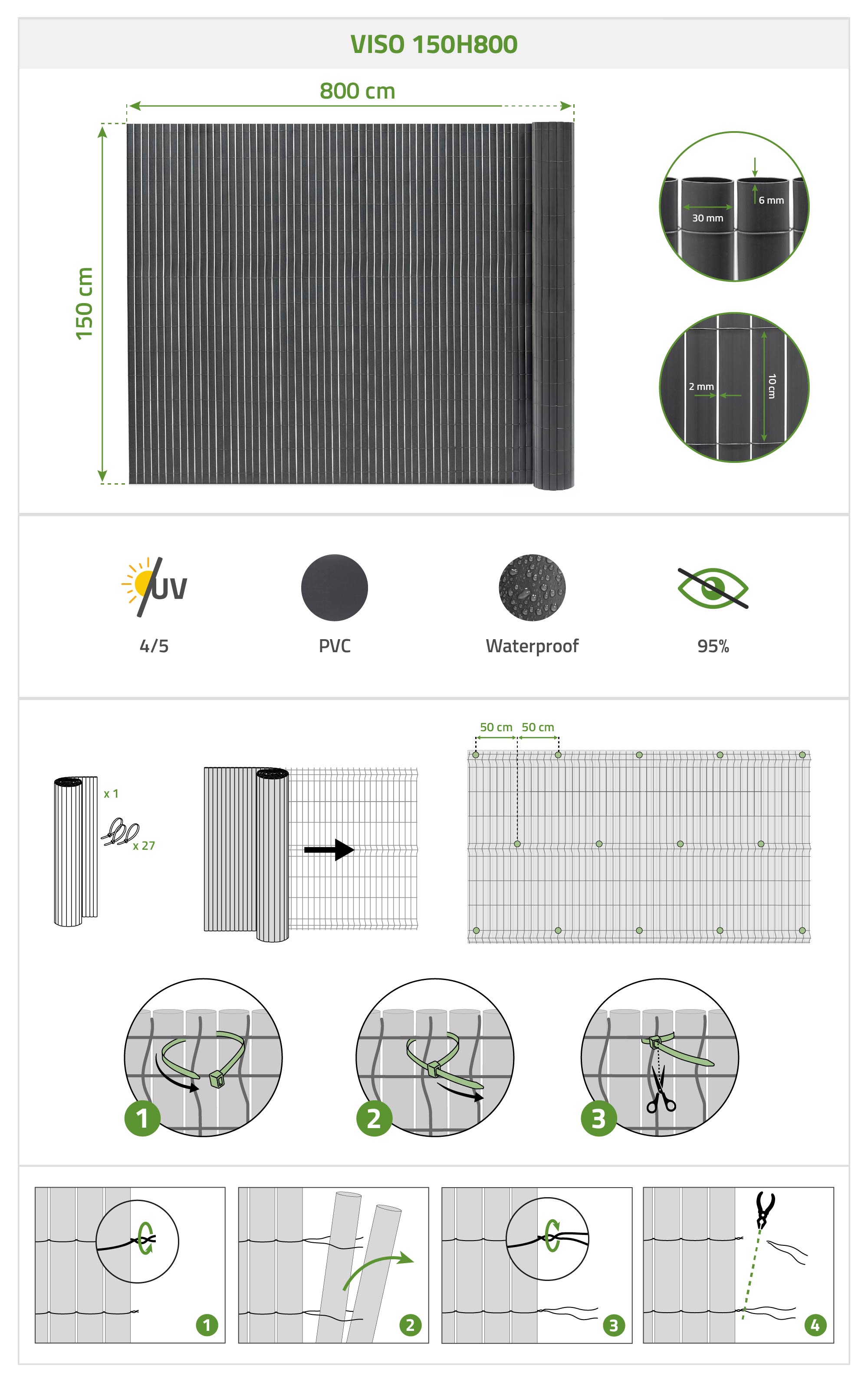 PVC sieťka VISO vyniká svojimi 30 mm širokými lamelami, ktoré ponúkajú až 95 % súkromia, pričom zachovávajú vaše súkromie a zároveň umožňujú prenikanie svetla. S hustotou 1,6 kg/m² zaručuje robustnú a stabilnú konštrukciu, jednoduchú inštaláciu a dlhú životnosť. Je odolná voči UV žiareniu a zachováva si nový vzhľad sezónu čo sezónu, čím vytvára sieťku na ochranu súkromia, ktorá je spoľahlivá aj esteticky príjemná. Lamely PVC sieťky VISO sú spojené kovovým drôtom s polyetylénovým (PE) plášťom. Tento montážny systém zaisťuje pevnejšiu konštrukciu, dlhotrvajúcu odolnosť a čistejší povrch ako tradičné nylonové drôty alebo lepené modely. Umožňuje vám tiež jednoducho nastaviť dĺžku siete podľa vašich potrieb.