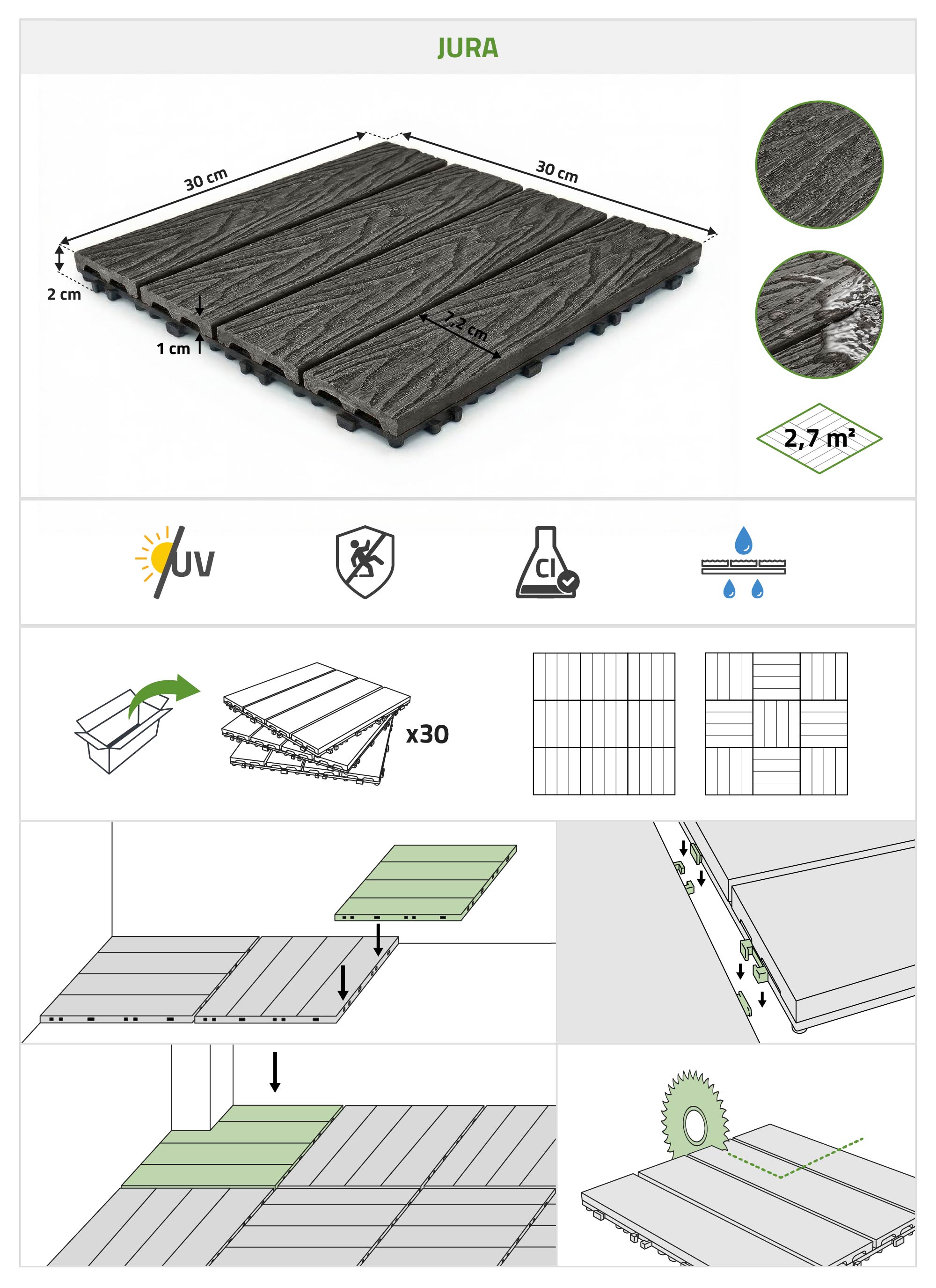 Rad JURA ponúka prepojené terasové dlaždice navrhnuté tak, aby kombinovali prírodný vzhľad s jednoduchou inštaláciou. Tieto prepojené vonkajšie dlaždice sú vhodné na terasy, balkóny a záhrady. Sú modulárne a ľahko sa inštalujú, takže vám umožňujú vytvoriť bezšvovú a odolnú vonkajšiu podlahu a zároveň zaručujú dlhodobú stabilitu a bezpečnosť.
